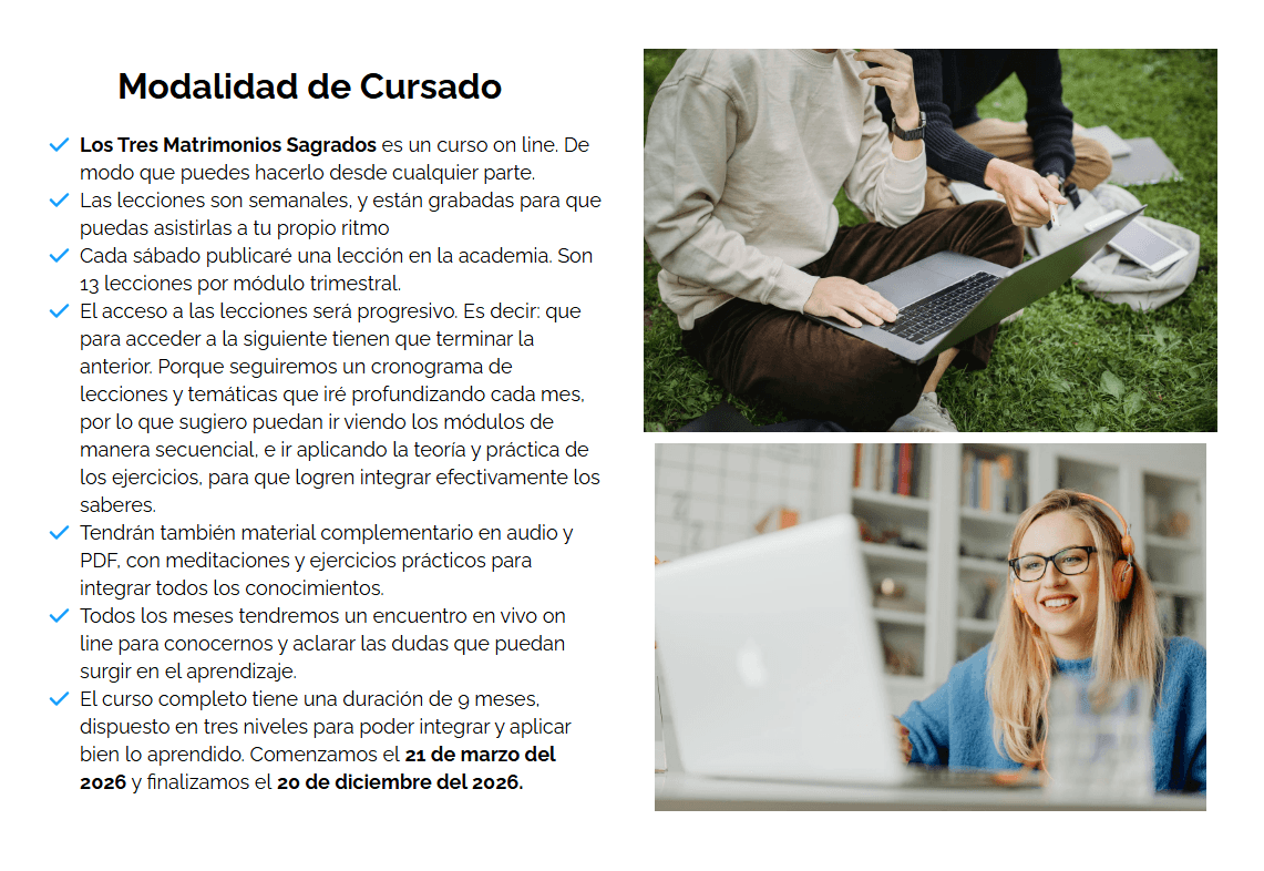 Aquí les brindo información referida al curso on line "LOS TRES MATRIMONIOS SAGRADOS", y los detalles de la BECA POR PRE INSCRIPCIÓN que estará vigente hasta el 8 de marzo del 2026 inclusive.